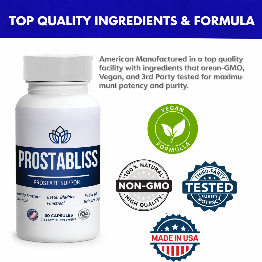 Manufactured in the USA in FDA-registered and GMP-certified facilities, ProstaBliss is made with natural, non-GMO ingredients and contains no harsh stimulants or synthetic additives. It comes in easy-to-take capsules, offering a simple and convenient way to support prostate health as men age.